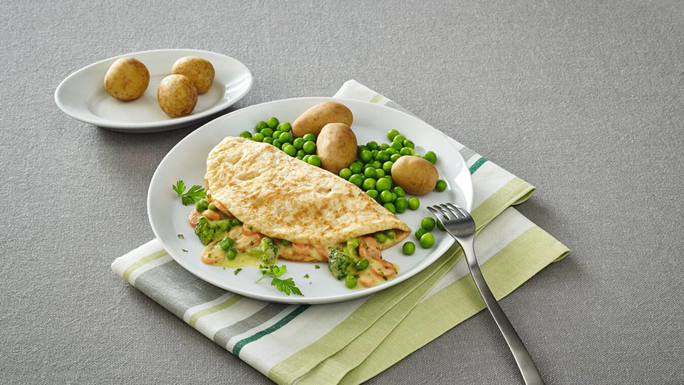 Herzhafter Pfannkuchen mit Gemüsefüllung dazu Erbsen "naturell" und kleine Kartoffeln mit Schale.