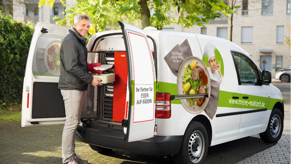 Die meisten unserer Standorte verfügen über unser einzigartiges FrischeMobil. In diesem kann der Kurier vom Fahrerraum aus die Öfen steuern und zu unterschiedlichen Zeitpunkten starten. Im Ofen wird Ihr Menü erst während der Fahrt zu Ihnen zu Ende gegart. Dadurch erhalten Sie, auch wenn Sie am Ende der Tour liegen, Ihr heißes Menü auf den Punkt genau gegart. Kein Qualitätsverlust durch langes Warmhalten - und das schmeckt man. Unsere freundlichen Kuriere bringen Ihnen die Menüs in Ihrer persönlichen Isolierbox. So geht die Wärme nicht verloren, bis Sie Ihr Essen genießen möchten. Für Salate und Desserts gibt es an Bord des FrischeMobils eine integrierte Kühlkammer.